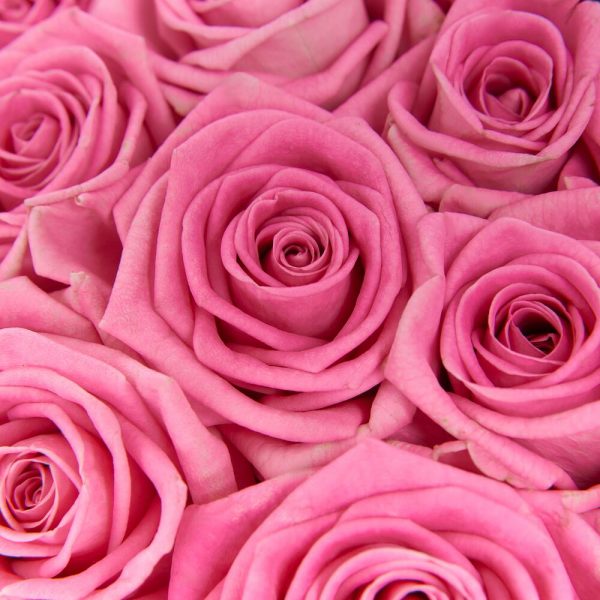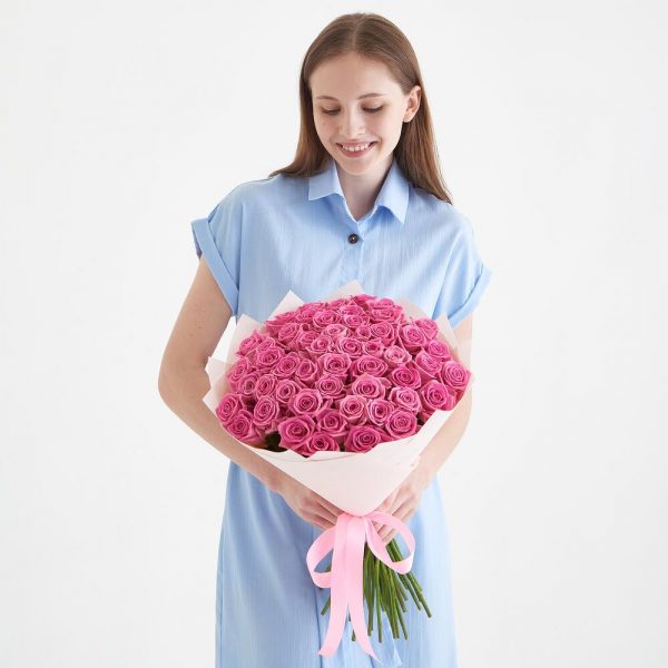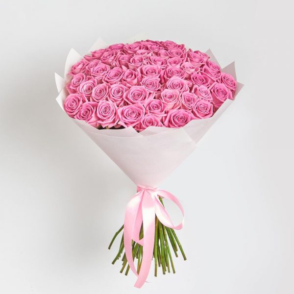 Великолепный классический букет из розовых роз сорта “Аква”, оформленных в латексную бумагу.